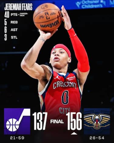 I Pelicans tornano a vincere dopo otto sconfitte in fila e infliggono il decimo ko consecutivo ai Jazz in una sfida dal punteggio altissimo. I padroni di casa, dopo essere andati all’intervallo sotto di 8 lunghezze, esplodono con un terzo quarto da 50-27 (record di franchigia) in cui Jordan Poole segna 22 dei suoi 34 punti, ma è il rookie Jeremiah Fears a prendersi la scena realizzando 40 punti, record per una matricola nella storia dei Pelicans approfittando delle assenze di Zion Williamson, Trey Murphy III, Dejounte Murray, Herb Jones e Saddiq Bey
