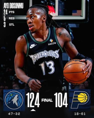 Vittoria importante per i Timberwolves, che toccano anche il +31 sul campo di Indiana guidati dai 24 di Ayo Dosunmu e i 19 a testa di Julius Randle e Bones Hyland. Con questo successo e la contemporanea sconfitta di Phoenix con Houston i T’Wolves si assicurano uno dei primi sei posti nella Western Conference. Sono invece 22 le sconfitte nelle ultime 26 partite dei Pacers, che non vanno oltre i 17 di Ethan Thompson
