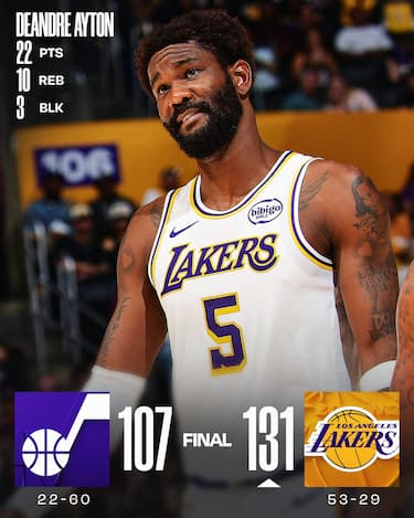 Deandre Ayton e Rui Hachimura, autori di doppie doppie identiche da 22 punti e 10 rimbalzi, guidano i Lakers alla agile vittoria su Utah, che però non basta per strappare il 3° posto a Ovest. È invece Oscar Tshiebwe il protagonista dell’ultima partita stagionale per i Jazz con 29 punti e 17 rimbalzi