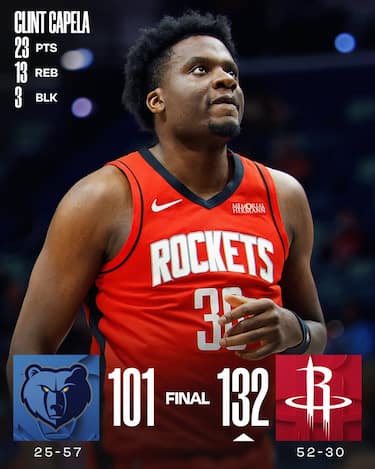Anche lasciando i titolari a riposto Houston, che trova la doppia doppia da 23 punti e 12 rimbalzi del veterano Clint Capela, batte agilmente Memphis e chiude al 5° posto a Ovest la sua regular season preparandosi a incontrare i Lakersal primo turno dei playoff. Dariq Whitehead è invece il migliore per i Grizzlies con 26 punti