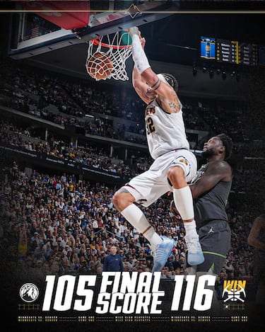 La prima partita di una serie che si preannuncia molto lunga va ai Nuggets, che rimontano dopo essere stati sotto anche di 12 lunghezze nel primo quarto, vanno avanti di 15 nel terzo e difendono il vantaggio fino alla fine, nonostante il ritorno di Minnesota fino al -2. A quel punto però la capacità di eseguire sotto pressione dei Nuggets fa la differenza, trovando maggiore energia dal pubblico di casa e prendendosi l'1-0 nella serie