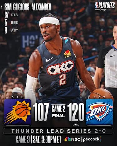 Come da pronostici i campioni in carica dei Thunder si portano sul 2-0 nella serie, concedendosi al massimo un momento di distrazione nel quarto periodo. I padroni di casa infatti rimangono sempre avanti dal secondo quarto in poi e a metà secondo tempo sono avanti di 26, ma un parziale di 20-4 riporta i Suns fino al -10 a poco meno di 5 minuti dalla fine — senza però avvicinarsi ulteriormente
