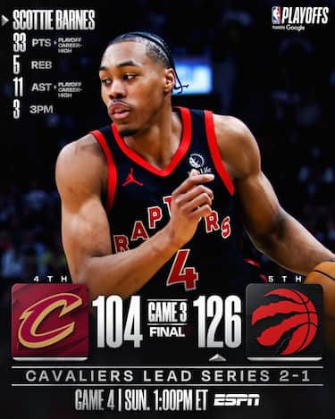 Ai playoff Toronto non batteva Cleveland da ben 12 partite e dopo essere andati sotto 0-2 nella serie i Raptorsreagiscono nella giusta maniera giocando una eccellente gara-3. La partita, in realtà, è equilibrata fino al termine del 3° quarto, quando i padroni di casa hanno 2 punti di vantaggio, ma l’ultima frazione di gioco è tutta di Toronto che travolge i Cavs con un parziale di 43-23 che gli permette di accorciare lo svantaggio e riaprire i giochi