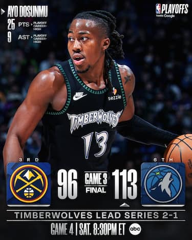 I numeri dicono 34.1% dal campo e 25% da tre, sono queste le percentuali concesse dai Timberwolves a Denver in gara-3, a riprova di una gara difensiva praticamente perfetta. In attacco, poi, a Anthony Edwards (17 punti) e Julius Randle (20 punti e 10 rimbalzi) basta avere una serata normale, anche per Ayo Dosunmu si prende la scena entrando dalla panchina con 25 punti, 9 assist e 10/15 al tiro