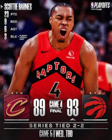 Partita dura in gara-4 tra Toronto e Cleveland, dove sono le difese a farla da padrone. I Cavs piazzano un parziale di15-3 che nel 4° quarto sembra lanciarli verso la vittoria, ma i Raptors, trascinati da Scottie Barnes e Brandon Ingram, autori di 23 punti a testa, rimontano e la spuntano in volata. A Cleveland, che chiude con il 36.8% dal campo di squadra, non bastano invece i 20 punti di Donovan Mitchell. Ora tocca a Portland, San Antonio, Philadelphia, Boston, Rockets e Lakers nelle restanti tre partite della domenica