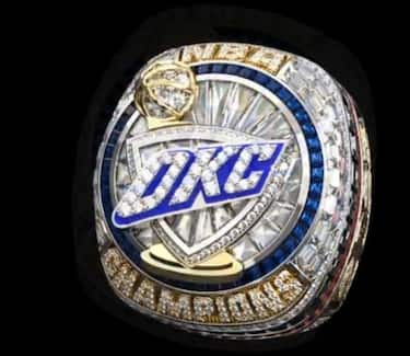 Il numero di canotta di ogni giocatore riportato sull'anello dedicato, e all'interno la riproduzione dell'immagine del Larry O'Brien Trophy alzato al cielo e il record (68-14) mandato a referto in regular season prima della trionfale cavalcata verso il primo titolo nella storia di Oklahoma City: all'anello dei Thunder non manca proprio nulla