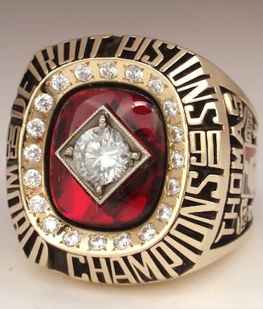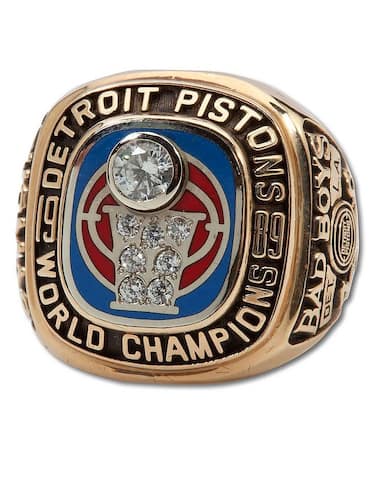 Un rombo con la centro un pallone di diamanti su sfondo rosso la fa da padrone sul secondo anello consecutivo dei Detroit Pistons di Isiah Thomas