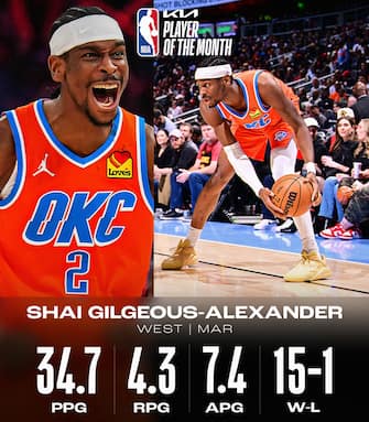 - Altro mese a livelli da MVP per la stella dei Thunder, che a marzo ha viaggiato a 34.7 punti, 7.4 assist e 4.3 rimbalzi di media, trascinando la squadra a un record di 15 vittorie e una sola sconfitta