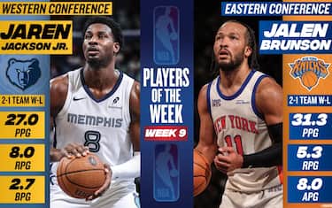 - Quattro vittorie su quattro e quasi 29 punti di media per Jalen Brunson, assoluto protagonista nella Eastern Conference alla guida dei suoi Knicks. Per lui anche 3 rimbalzi e 4.5 assist a partita, rimettendo in carreggiata New York dopo qualche settimana di appannamento. È il suo ottavo premio in carriera, tutti con la maglia bluarancio