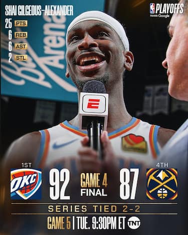 Gara-2 tra Thunder e Nuggets si trasforma subito nella più classica rivincita della squadra di casa che ha perso la partita precedente. Oklahoma City domina fino dai primi possessi, chiude il primo tempo a +31 e alla fine vince facendo anche segnare il record di franchigia per punti in una partita di playoff. Serata da dimenticare per Denver, che paga forse lo sforzo profuso nella incredibile rimonta di gara-1 e accusa un po' di fatica probabilmente riveniente anche dalla serie precedente contro i Clippers