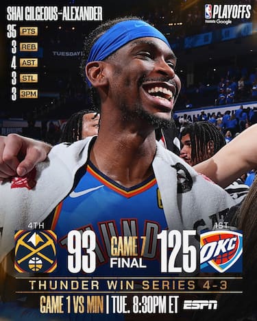 È stata forse la serie più bella e combattuta di questi playoff, e in gara-7 Oklahoma City e Denver non hanno deluso le attese. In campo con un Aaron Gordon evidentemente infortunato, però, i Nuggets reggono solo per la prima metà di gara, ma subiscono due parziali molto pesanti già nel 2° quarto che indirizzano la partita. Nel secondo tempo, poi, i Thunder, guidati dalla coppia formata da Shai Gilgeous-Alexander e Jalen Williams, allargano il loro vantaggio e volano alle finali della Western Conference
