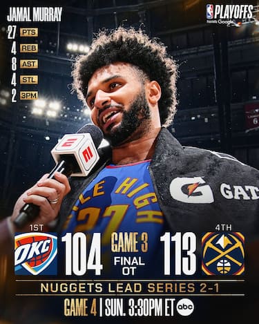In gara-3 torna a regnare l'equilibrio tra Nuggets e Thunder, tanto che per decidere la sfida occorre addirittura un tempo supplementare. In una serata in cui le due grandi stelle delle due squadre non brillano, sono Jamal Murray (27 punti) da una parte e Jalen Williams (32) a fare la differenza. E nell'overtime emerge la maggior esperienza di Denver che piazza un parziale di 11-2 e si assicura il colpo del 2-1 nella serie