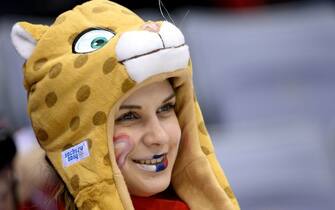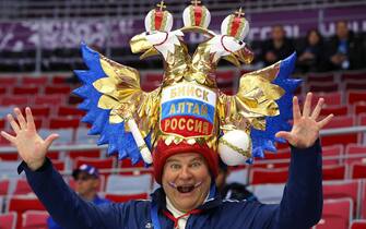 Il cappello di un tifoso russo alla partita di hockey Russia-Finlandia al Bolshoy Stadium -