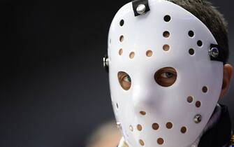 Portiere di hockey o il terribile Jason che sfidava Freddy Krueger? In realtà è solo un tifoso, ma lo sguardo è minaccioso... -