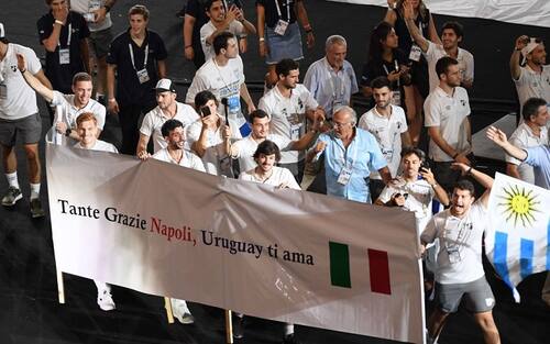 La delegazione dell'Uruguay si è presentata con un "Tante grazie Napoli". Un modo per farsi subito volere bene dal pubblico napoletano...