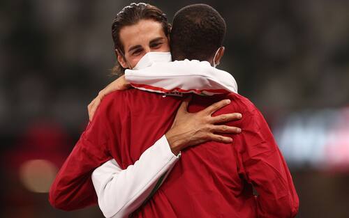 Ed ecco la scena bellissima: il protocollo Covid impone agli atleti di indossare da soli la medaglia al collo. Tamberi e Barshim si sono premiati a vicenda, l'uno mettendo al collo dell'altro l'oro.