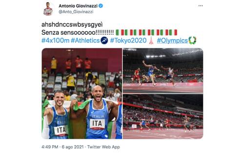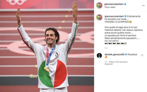 TAMBERI: "HO I BRIVIDI" - "Praticamente ho lanciato una moda.... VINCERE LE OLIMPIADI! Con quello di oggi sono 5 ori per l'atletica italiana, mai nessun capitano aveva avuto questo onore.... La squadra più forte di sempre! Siete semplicemente pazzeschi.....Ho i brividi!!!!!"