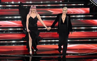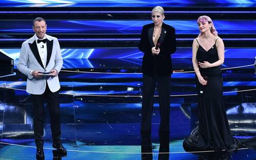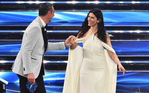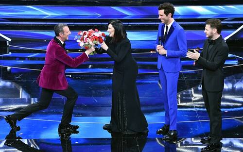 È GIA' INTER-MILAN. Piccolo siparietto calcistico in vista del derby di Milano, in programma il 6 febbraio: "Vedo troppo nerazzurro stasera", scherza la Pausini, grande fan milanista, riferendosi al colore degli abiti di Mika e Cattelan e ad Amadeus, tifosissimo dell'Inter, che provvede subito 'compensando' con dei fiori rossi per la cantante di Faenza.