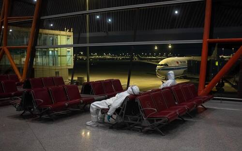 Immagini surreali dall'aeroporto di Pechino, completamente vuoto con la conclusione delle Olimpiadi invernali: bar chiusi e saracinesche delle boutique abbassate, ma gli scatti testimoniano soprattutto la stanchezza degli operatori sanitari, costretti agli straordinari nelle scorse settimane per l'estenuante lavoro nella grande 'bolla' anti-covid