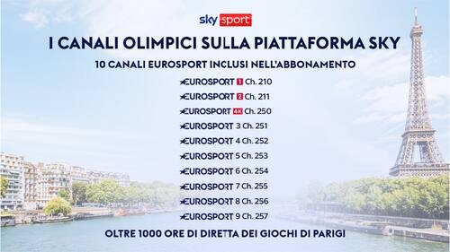 - Ai due canali Eurosport 1 ed Eurosport 2 si aggiungono 8 nuovi canali interamente dedicati all’evento – di cui uno in 4K – su cui poter seguire molte altre discipline sportive. In totale, saranno più di 1000 le ore di diretta aggiuntive disponibili su Sky e molti contenuti saranno anche on demand.