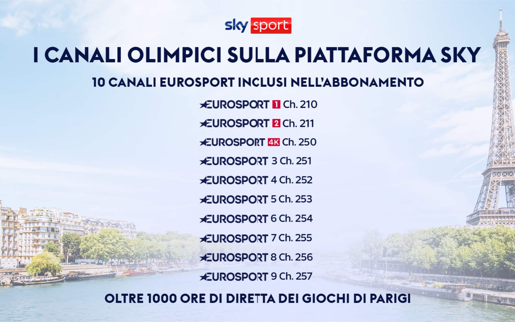 Gli abbonati Sky avranno a disposizione ben 10 canali Eurosport, inclusi nel loro abbonamento, per seguire i Giochi Olimpici di Parigi 2024. Ai due canali Eurosport 1 ed Eurosport 2 si aggiungono 8 nuovi canali interamente dedicati all’evento – di cui uno in 4K – su cui poter seguire molte altre discipline sportive. In totale, saranno più di 1000 le ore di diretta aggiuntive disponibili su Sky.