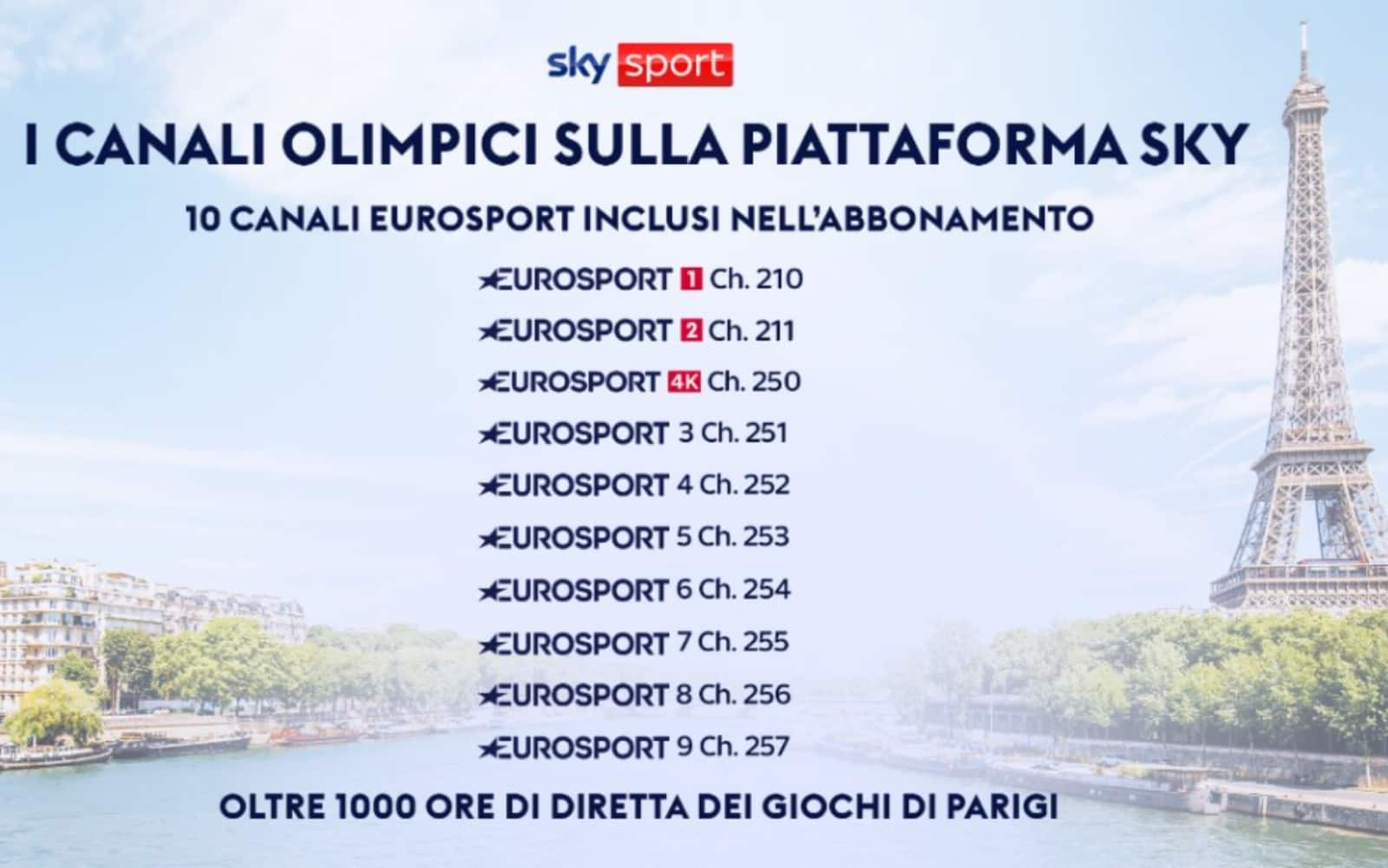Il recente accordo tra Sky e Warner Bros. Discovery ha consentito un ampliamento dell’offerta dei canali Eurosport disponibili su Sky. Per seguire le Olimpiadi, gli abbonati Sky avranno così a disposizione ben 10 canali Eurosport, inclusi nel loro abbonamento: ai due canali Eurosport 1 ed Eurosport 2 visibili anche in streaming su NOW, si aggiungeranno 8 nuovi canali interamente dedicati all’evento, tra cui Eurosport 4K (disponibile senza costi aggiuntivi per i clienti Sky con servizio opzionale Sky HD 4K/Sky Ultra HD attivo). I canali aggiuntivi di Eurosport in HD per le Olimpiadi di Parigi 2024 saranno inclusi nell’abbonamento dei clienti Sky e saranno visibili anche su Sky Go. In totale, saranno più di 1.000 le ore di diretta aggiuntive disponibili su Sky e molti contenuti saranno anche on demand.