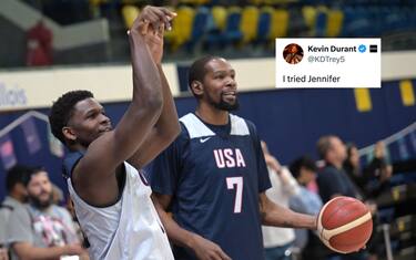 Durante un allenamento di Team USA a Parigi, Anthony Edwards ha riservato a Kevin Durant un "bentornato" di livello, schiacciandogli sulla testa come immortalato da uno scatto. Una volta che la foto è arrivata sui social. KD l'ha presa sul ridere citando un celebre tweet di CJ McCollum: "Ci ho provato, Jennifer"