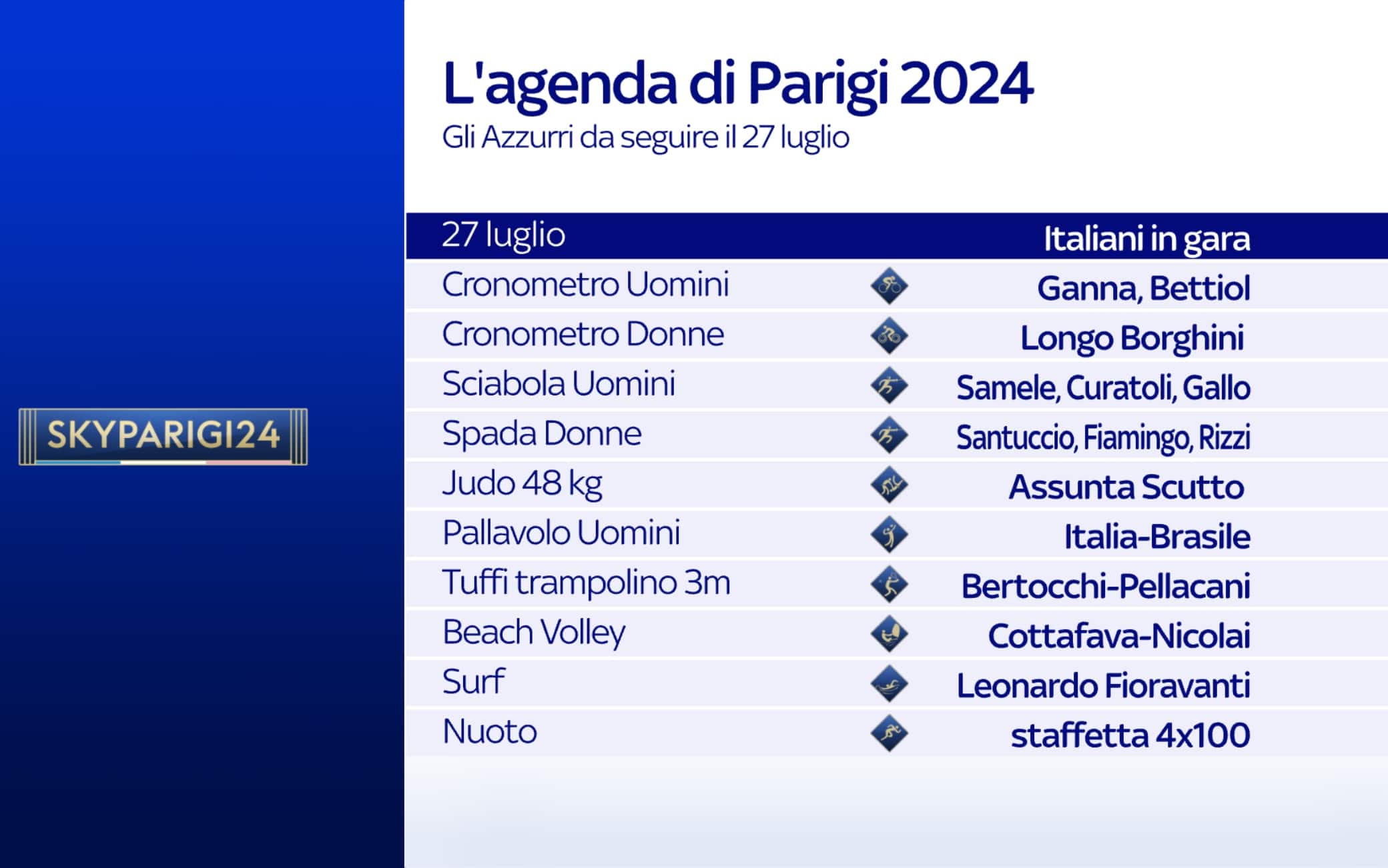Sabato 27 luglio i Giochi Olimpici entrano nel vivo: l'Italia esordirà in ben 12 discipline, con alcuni atleti che avranno già la possibilità di andare a medaglia, come Longo Borghini e Ganna nel ciclismo e Bertocchi e Pellacani nei tuffi. L'Italvolley maschile affronterà il Brasile e sarà anche il turno di tennisti, nuotatori, schermidori e pugili. Ma non sono gli unici: di seguito tutto il programma della giornata