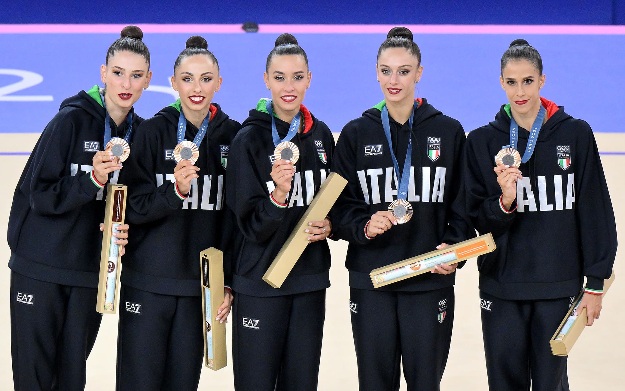 Le Farfalle sono ancora di bronzo. A distanza di tre anni dalla medaglia ottenuta a Tokyo, l'Italia della ginnastica ritmica si conferma sul terzo gradino del podio olimpico a Parigi 2024 nella finale dell'all-around a squadre. Applausi per Alessia Maurelli, Martina Centofanti, Agnese Duranti, Daniela Mogurean e Laura Paris che chiudono con il punteggio di 68.100 alle spalle di Israele (68.850) e delle cinesi (oro con 69.800). Qualificate in finale con il secondo punteggio (69.350) dietro alle Bulgaria, le ragazze guidate da Emanuela Maccarani restano sul podio ai Giochi.