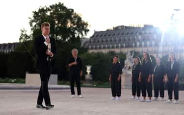 La cerimonia inizia fuori dallo stadio, con un'esibizione musicale: Zaho de Sagazan canta "Sous le ciel de Paris" di Edith Piaf, al Jardin des Tuileries davanti al braciere olimpico