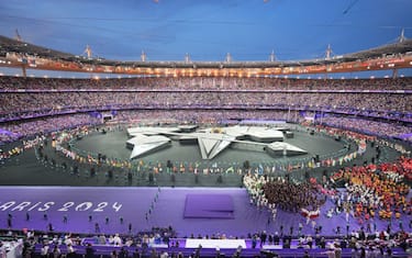 Ora sfilano dentro lo Stade de France alcuni volontari dell'organizzazione di Parigi 2024, applauditi dai 70mila dello Stade de France