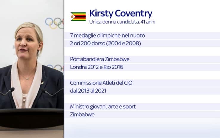 dello sport mondiale. Coventry, ministro dello sport dello Zimbabwe, è stata due volte campionessa olimpica nei 200 dorso di nuoto, ad Atene 2004 e Pechino 2008, ottenendo anche 4 argenti e un bronzo ai Giochi. Accreditata del supporto del presidente uscente Thomas Bach, ha sbaragliato a sorpresa i sei concorrenti già dal primo turno di voto dell'Assemblea Cio in corso a Costa Navarino, in Gracia, superando subito il quorum necessario di 49 preferenze.