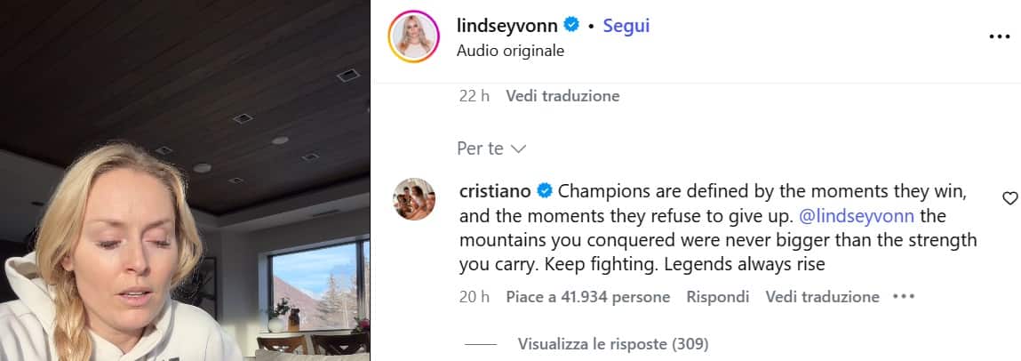 Due settimane dopo la caduta a Milano-Cortina in discesa libera, e dopo gli interventi chirurgici in Italia e negli Stati Uniti per ridurre le fratture alla tibia, la campionessa americana ha lasciato l'ospedale e con un video sui social ha rivelato: "Ho rischiato l'amputazione della gamba, ci vorrà circa un anno perché tutte le ossa guariscano poi deciderò se tornare in sala operatoria per togliere le placche e riparare il mio crociato". Il suo post è stato commentato anche da diversi atleti di varie discipline, tra i quali Cristiano Ronaldo. Il portoghese ha scritto un toccante messaggio. "I campioni si definiscono per i momenti in cui vincono e per quelli in cui si rifiutano di arrendersi. Lindsey Vonn, le montagne che hai conquistato non sono mai state più grandi della forza che porti dentro di te. Continua a combattere. Le leggende si rialzano sempre". Vonn ha risposto al cinque volte Pallone d'Oro: "Detto da te significa moltissimo".