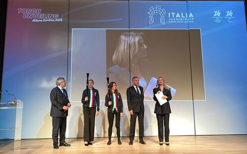 Mostrata per la prima volta in contemporanea alla Triennale di Milano e all’Expo di Osaka la torcia olimpica di Milano-Cortina, che il 26 novembre partirà da Olimpia per giungere a Milano il 6 febbraio 2026. A portare sul palco milanese le due torce (olimpica e paralimpica) Stefania Belmondo e Bebe Vio, mentre in Giappone venivano svelate da Carolina Kostner e Martina Caironi