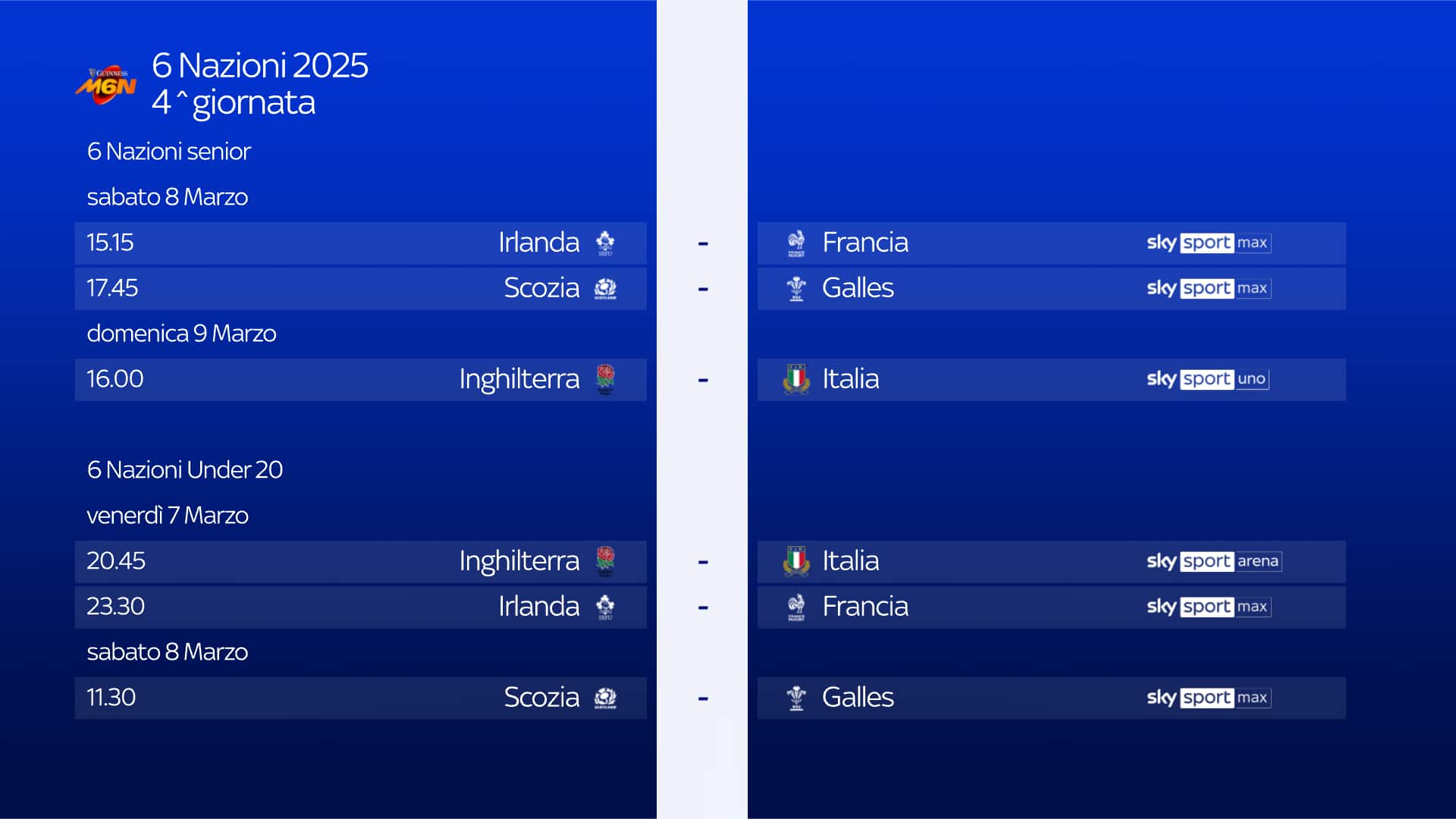 Per la quarta giornata, occhi puntati sull’Allianz Stadium di Twickenham, Londra: domenica 9 marzo alle 16 in campo Inghilterra e Italia. La sfida sarà in diretta su Sky Sport Uno e NOW, con un ricco pre-partita che scatterà dalle 15.15, con le leggende azzurre Diego Dominguez, Andrea De Rossi e Martin Castrogiovanni. Francesco Pierantozzi sarà il telecronista insieme a Federico Fusetti; Moreno Molla l’inviato a bordocampo.