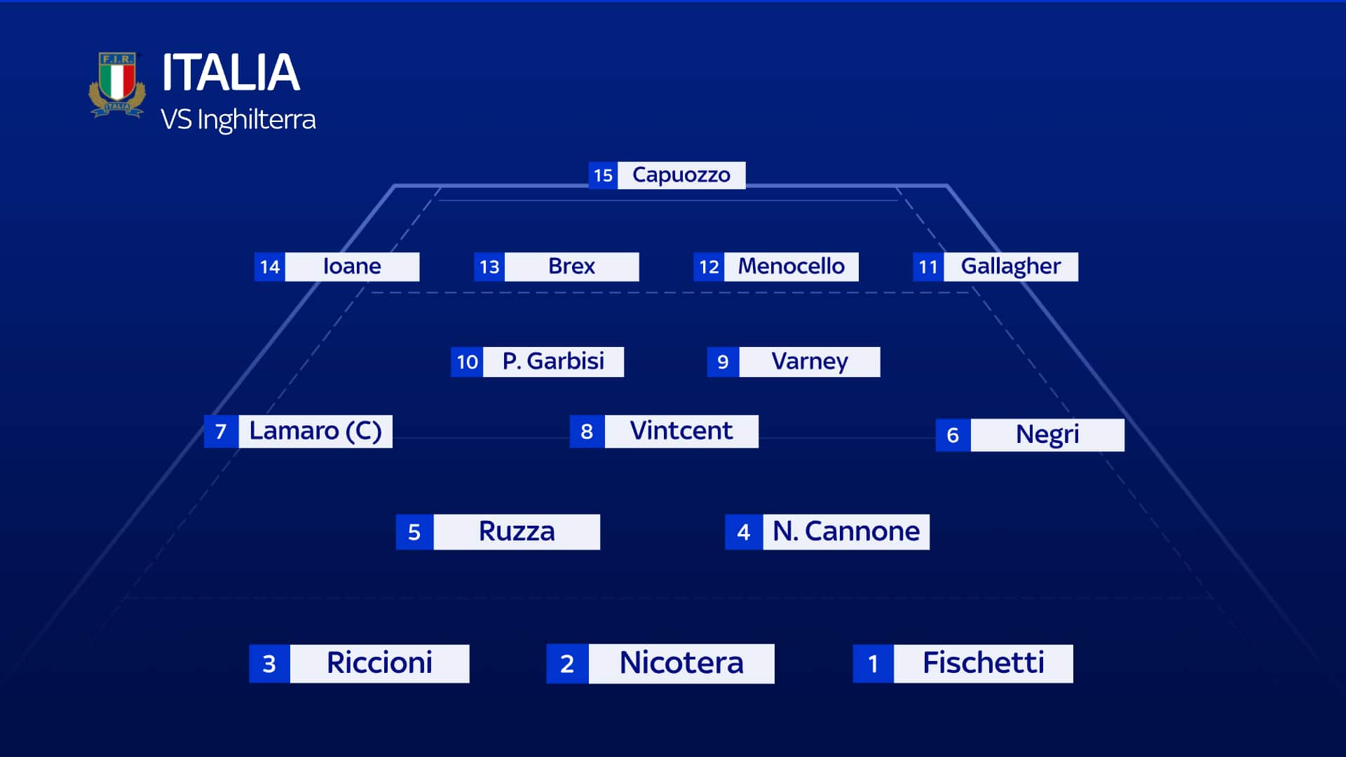 Per la sfida di Londra contro l'Inghilterra il Ct Quesada cambia sei giocatori rispetto al XV di partenza contro la Francia. Rientra dall'infortunio Ioane all'ala, Ange Capuozzo ritorna estremo, Allan in panchina e debutto nel torneo 2025 per Matt Gallagher. Prima partenza da titolari in questo Sei Nazioni anche per Ross Vintcent e Marco Riccioni tra gli avanti. Arbitrerà il match l'irlandese Andrew Brace.