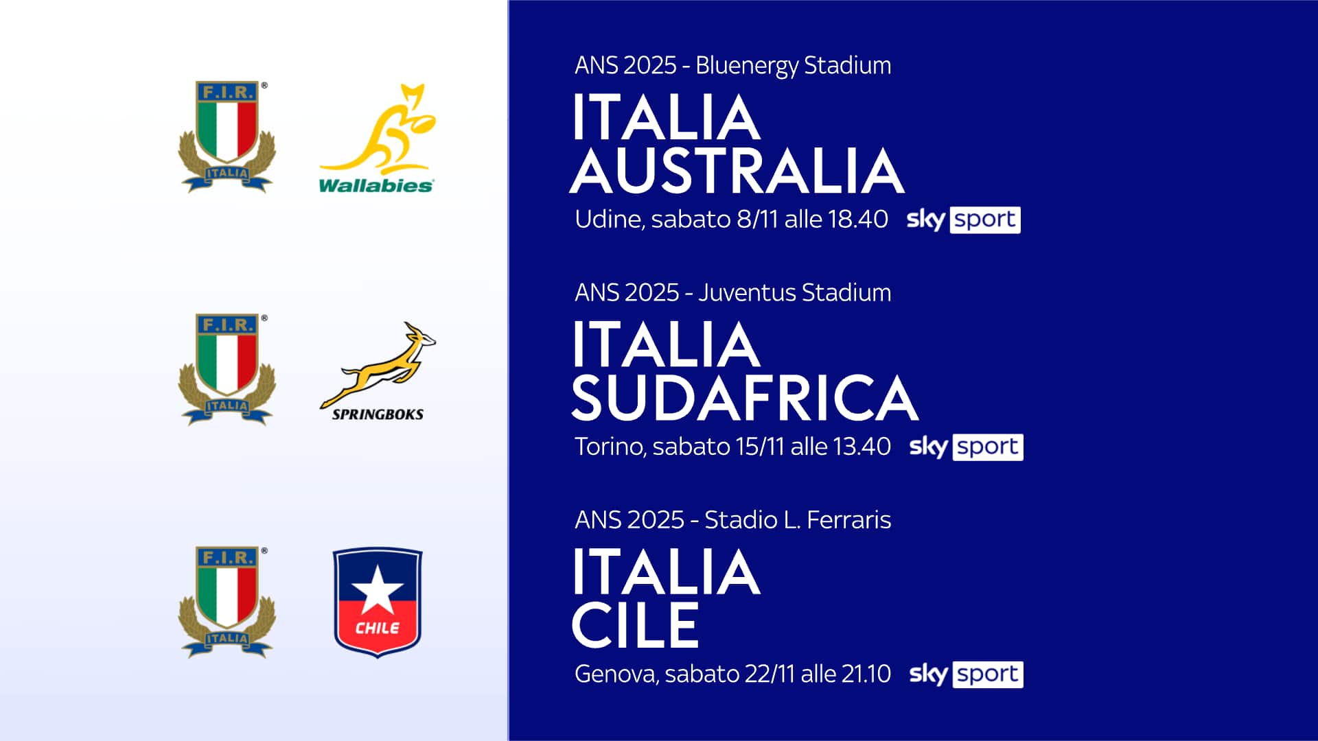 L'Italia affronterà l'8 novembre, a Udine, l'Australia; poi il 15 novembre a Torino il Sudafrica e il 22 novembre, a Genova, il Cile. Tutti e tre i test-match da seguire sui canali di Sky Sport e in streaming su NOW.