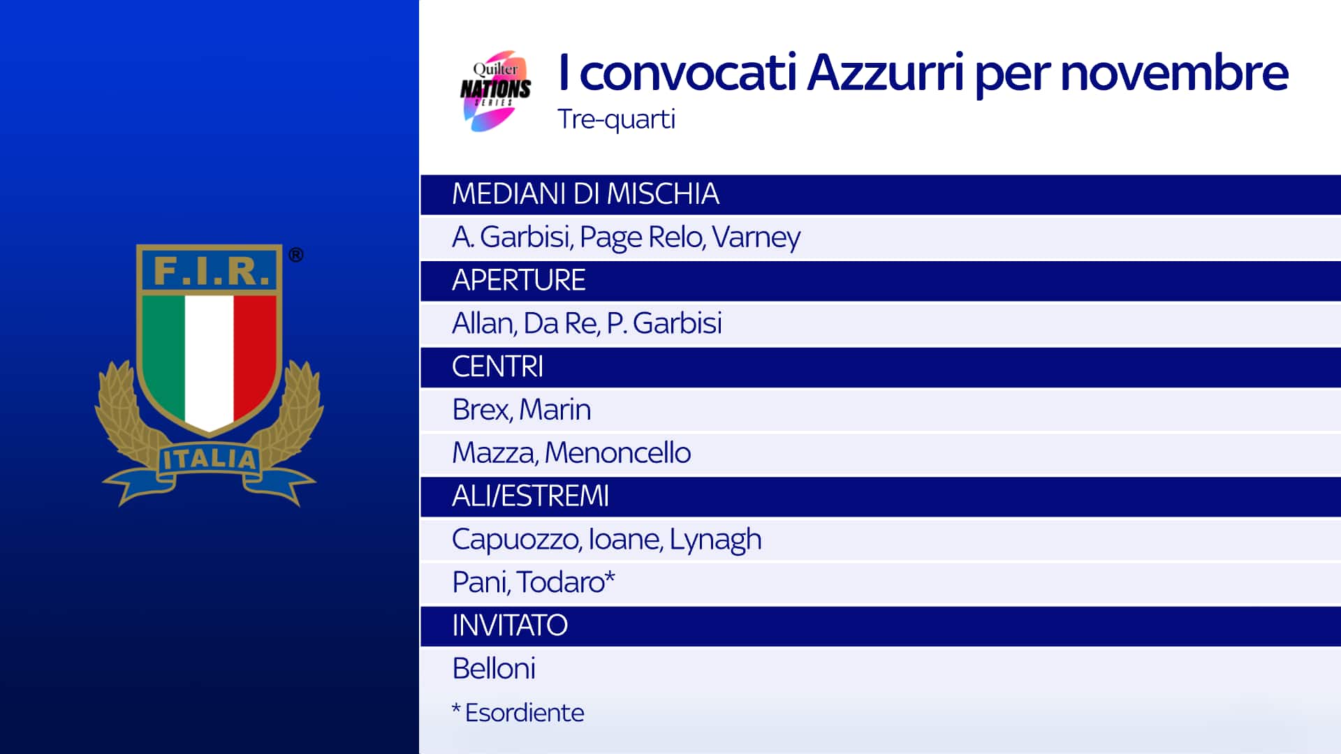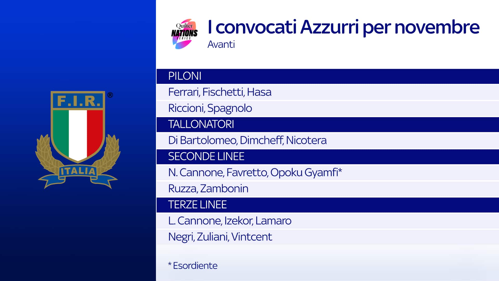 Gonzalo Quesada, Ct della nazionale italiana di rugby, ha annunciato i nomi dei giocatori convocati per i test-match di novembre. Si tratta di 34 giocatori più un invitato, Mirko Belloni. 19 gli avanti e 15 i tre-quarti. 14 atleti giocano nel Benetton, 5 alle Zebre e 15 all'estero. Ritornano in nazionale anche i veterani che erano stati tenuti a riposo per il tour estivo in Nambia e Sudafrica come Ruzza e Lamaro, Due gli esordienti. Fra gli avanti, in seconda linea Enoch Opoku Gyamfi che gioca nel Bath e già nazionale Under 20.