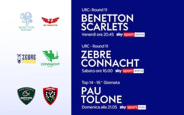 Ultimo weekend prima del Sei Nazioni di rugby. Si gioca nei vari campionati europei: tre le partite da seguire live su Sky e NOW. Si comincia venerdì sera con l'URC su Sky Sport Arena con Benetton-Scarlets. Sabato, stesso canale, alle ore 16, Zebre-Connacht. Domenica, alle 21.05 su Sky Sport Max, Pau-Tolone, posticipo della 16^ giornata del campionato francese