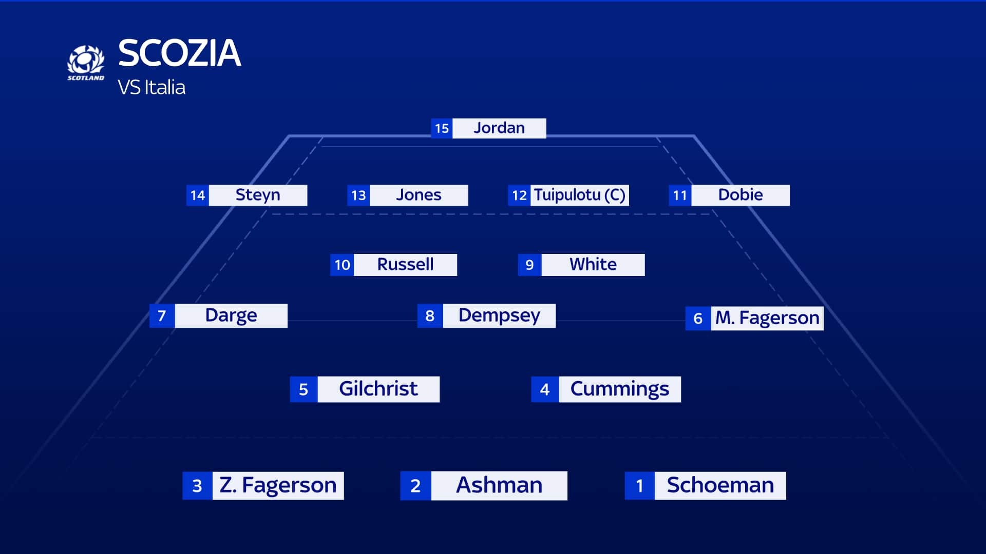 Inedito triangolo allargato con Marin nel ruolo di estremo e Ioane-Lynagh. Torna la coppia di centri formata da Brex e Menoncello, mentre le chiavi della mediana saranno affidate a Paolo Garbisi e Alessandro Fusco che ha collezionato il primo cap da titolare nel Sei Nazioni proprio contro la Scozia nel 2023 a Edimburgo. In terza linea – insieme a capitan Lamaro – ci saranno Lorenzo Cannone e Zuliani. In seconda linea Zambonin e Niccolò Cannone, mentre in prima linea scenderanno in campo Ferrari, Nicotera e Fischetti. Prima convocazione in lista gara – nel Guinness Sei Nazioni – per Di Bartolomeo, Hasa e Da Re. Insieme ai tre giocatori in forza alle Zebre, pronti a subentrare dalla panchina Spagnolo, Ruzza, Favretto, Alessandro Garbisi e Pani. Non sarà disponibile per la partita Martin Page-Relo: il mediano di mischia in forza al Bordeaux non ha recuperato dal suo infortunio ed è rientrato al suo club di appartenenza, mentre Stephen Varney in settimana ha svolto allenamento differenziato per recuperare da un infortunio muscolare agli adduttori.