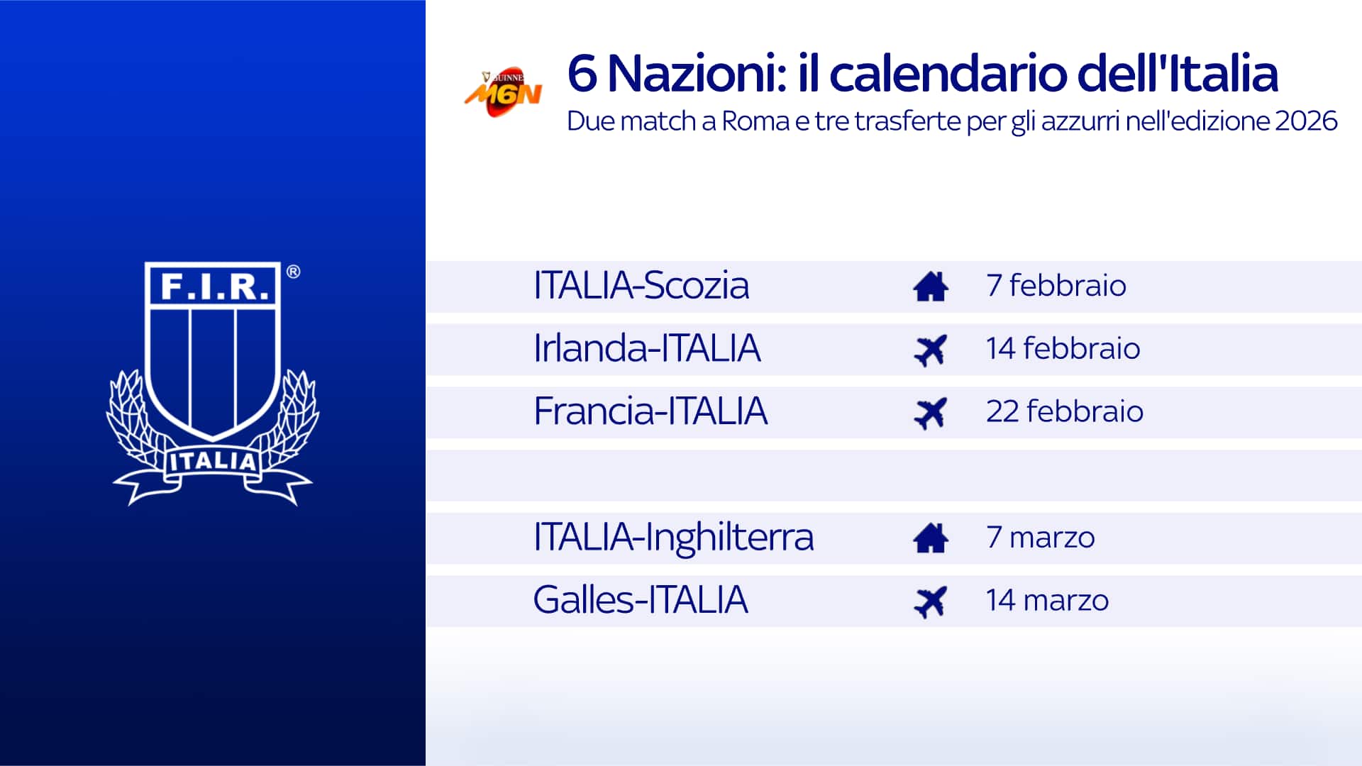 L’esordio degli Azzurri di Gonzalo Quesada contro la Scozia a Roma, in un Olimpico che si preannuncia tutto esaurito, è fissato alle 15.10 di sabato 7 febbraio, in diretta su Sky Sport Uno e in chiaro su TV8. La telecronaca sarà di Francesco Pierantozzi, con il commento tecnico di Federico Fusetti e le interviste a bordocampo di Moreno Molla. Studi pre e post partita da Roma con Martin Castrogiovanni, Andrea De Rossi e Diego Dominguez. A seguire, alle 17.40, ancora su Sky Sport Uno, l’Inghilterra, a cui il trofeo manca dal 2020, affronta il Galles nella leggendaria cornice del Twickenham Stadium di Londra.