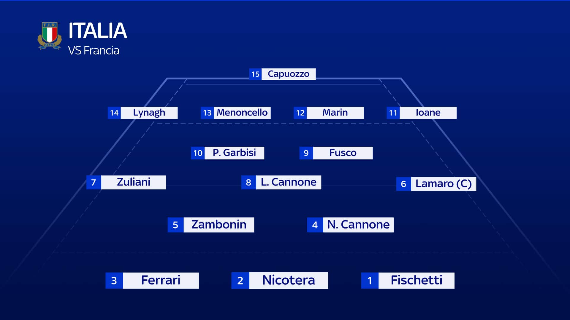 Un solo cambio rispetto alla partita contro l’Irlanda nel XV iniziale dell’Italia che, nel match che metterà in palio il Trofeo Garibaldi, giocherà per l’occasione con la maglia interamente in ‘Rosso Garibaldi’, colore che richiama le giubbe dei garibaldini. Rientra Capuozzo che torna a vestire la maglia numero 15 dopo l’infortunio con il club che lo ha tenuto ai box per le prime due partite del Sei Nazioni