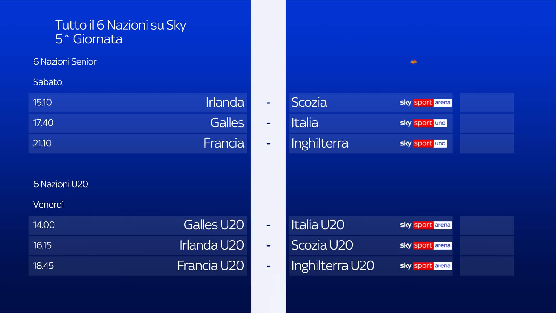 Quinta giornata del Sei Nazioni. L'Italia chiude in Galles, calcio d'inizio sabato alle 17.40, live su Sky Sport Uno e NOW (dalle 17 con ampio pre-partita). Tre i cambi per Quesada rispetto al XV che ha fatto la storia battendo per la prima volta l'Inghilterra sabato scorso