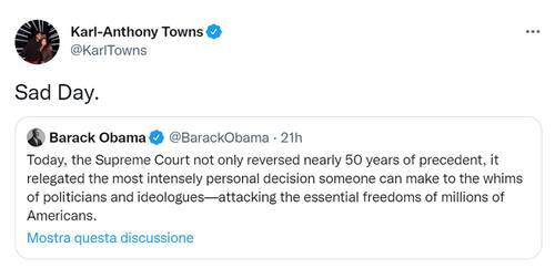 KARL-ANTHONY TOWNS | Anche la superstar dei Minnesota Timberwolves della NBA riprende il tweet dell'ex presidente USA Barack Obama - che definisce la sentenza "un passo indietro di 50 anni" e "un attacco alle libertà dei cittadini americani", commentando con due sole parole: "Giornata triste"
