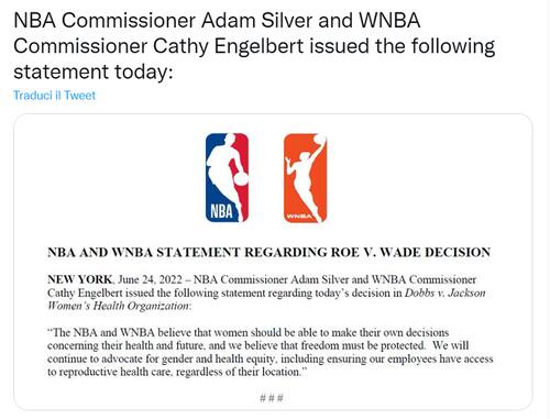 NBA & WNBA | Nel messaggio congiunto affidato dai due commissioner, Adam Silver per la NBA e Cathy Engelbert per la WNBA, si ribadisce come le due leghe "credano che le donne dovrebbero essere in grado di decidere da sole della propria salute e del proprio futuro. Per questo - hanno scritto - continueremo a sostenere l'equità di genere e sanitaria, inclusa la garanzia che i nostri dipendenti abbiano accesso all'assistenza sanitaria riproduttiva, indipendentemente da dove si trovino"