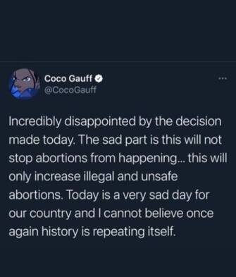 COCO GAUFF | Anche la tennista statunitense, come Billie King, ha sottolineato come la decisione "non metterà certamente fine alla pratica dell'aborto, ma la renderà soltanto molto più pericolosa e insicura". Dicendosi "delusissima dalla decisione della Corte Suprema", definisce la giornata "una delle più tristi nella nostra storia: non voglio credere che la storia torni a ripetersi in questo modo"