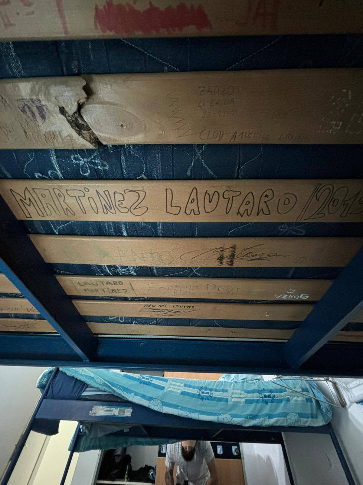 Difficoltà che ha ebbe anche Lautaro nel 2014, quando l’istinto di mollare tutto e tornare a casa fu forte. Proprio Cecilia, insieme ad alcuni compagni dell’epoca, gli fece cambiare idea. Oggi una delle stanze di Casa Tita, rigorosamente la numero 10, si chiama habitacion Lautaro Martinez, proprio affianco a quella di Diego Milito. In questa “pension” dalle regole ferree (ad esempio non non si entra con le scarpe da calcio) si dorme in camere da quattro con letti a castello, dove ai ragazzi però è concesso scrivere sulle doghe del letto superiore i loro nomi, le loro firme. La filosofia è quella di far lasciare un’impronta per chi verrà dopo, in modo che prima di chiudere gli occhi o al risveglio la mattina i ragazzi possano leggere i nomi di chi ha dormito in quei letti, motivandosi anche nei momenti difficili a inseguire il proprio sogno. Vi facciamo vedere in esclusiva il letto sul quale dormiva Lautaro Martinez nel 2015 durante il suo periodo a Casa Tita, pieno di scritte lasciate da un ragazzo che da lì è arrivato fino alla cima del mondo.