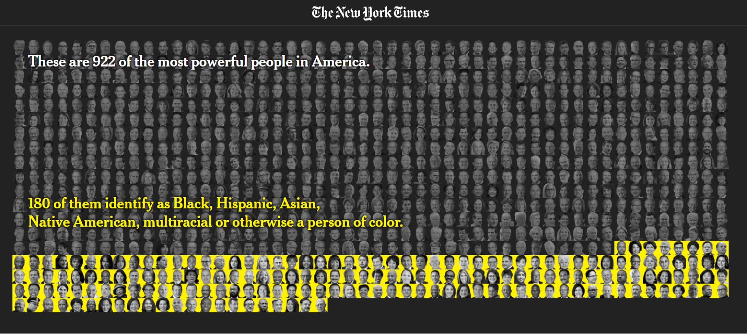 FLAVIO TRANQUILLO | Il 9 settembre il The New York Times ha pubblicato un articolo in cui ha fatto vedere le fotografie di quelle che, a giudizio della testata, di solito piuttosto prestigiosa, sono le 922 persone che detengono veramente il potere e determinano le scelte negli Stati Uniti. Sono senatori, congressmen, grandi uomini d'azienda. L'idea del The New York Times è stata quella di far vedere in bianco e nero quelli che non sono di colore e virati in giallo quelli che sono di colore: 180 su 922.