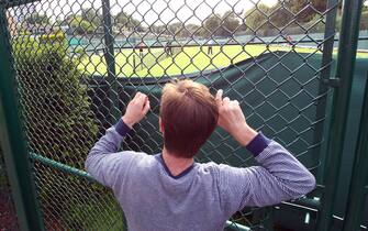 Un tifoso cerca di sbirciare attraverso le reti per seguire gli allenamenti dei campioni