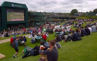 Il pubblico con biglietti per i "grounds", i campi secondari, assiste dalla Henman Hill ai match in corso sui campi principali che vengono trasmessi su un maxi schermo -